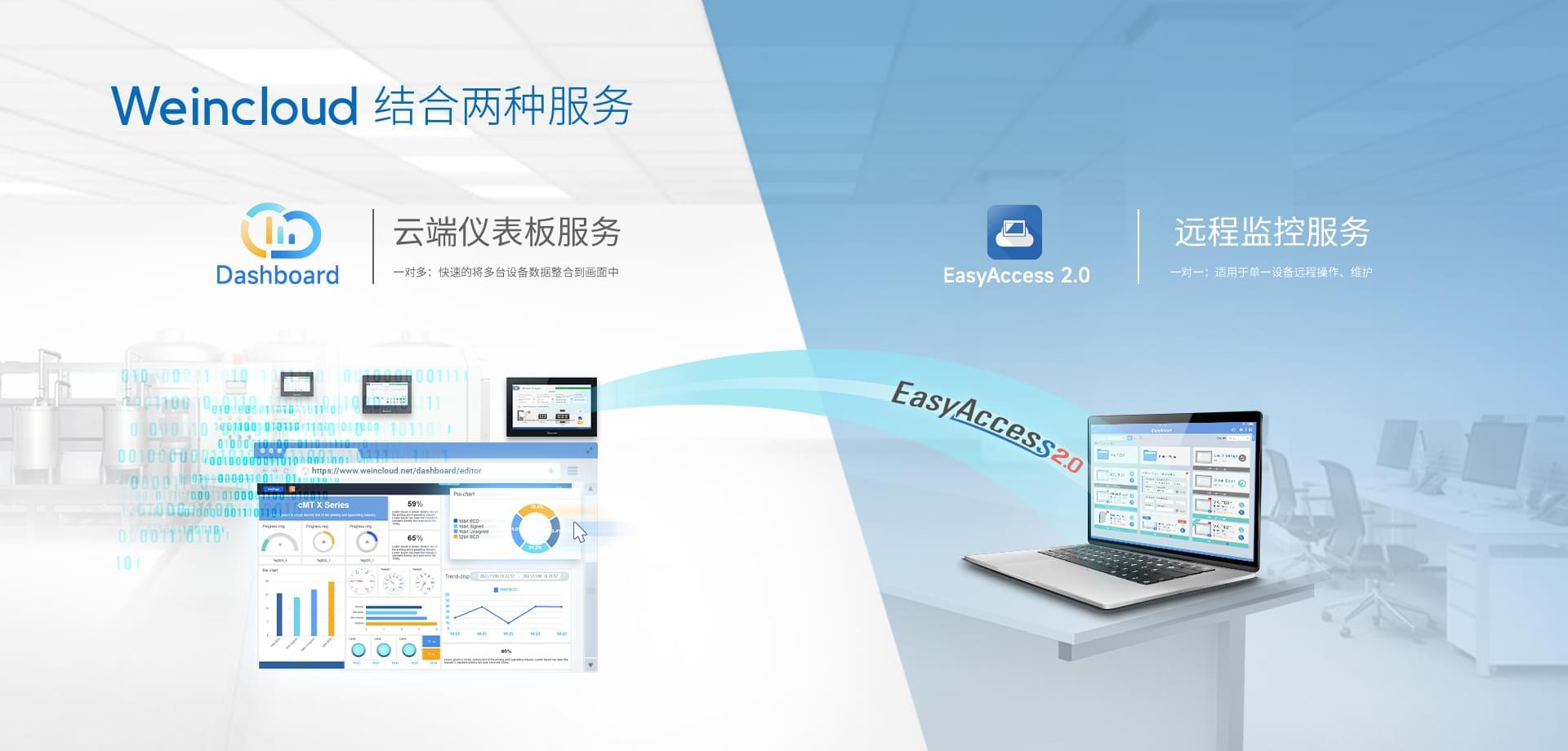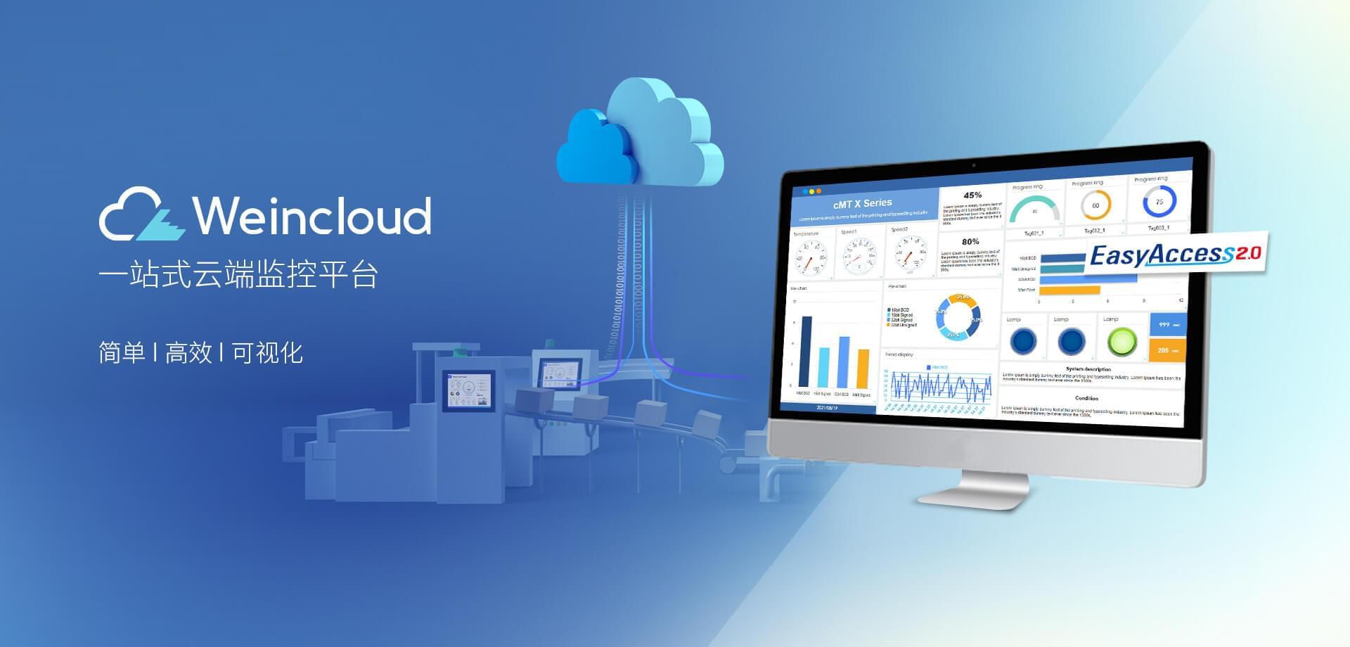 Weincloud 集結EasyAccess2.0遠程監(jiān)控服務及Dashboard云端儀表服務,將設備資料數(shù)據上云并以視覺化呈現(xiàn),協(xié)助管理者實時掌控現(xiàn)場產線狀態(tài)。